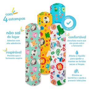 Atraente para crianças: as estampas coloridas e divertidas ajudam a transformar a experiência de cuidar de machucados em um momento mais leve e tranquilo. Higiene garantida: embalados individualmente, os curativos permanecem limpos e prontos para uso a qualquer momento. Conforto e segurança: materiais de alta qualidade que não irritam a pele e permitem a respiração adequada do machucado. Indicações de uso: