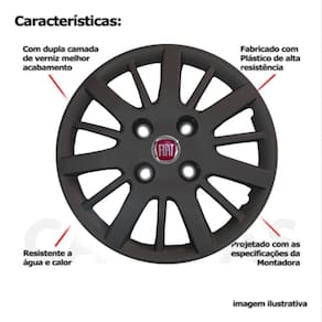 CARACTERÍSTICAS: - Fabricado em Plástico Resistente - Com dupla camada de verniz - Resistente a água e calor - Feito de acordo com os padrões da montadora - Fixação: por Parafusos - Furação: 4x100 - Cubo: Baixo - Cor: Preto - Referência: 074cb - Marca: Grid Calotas