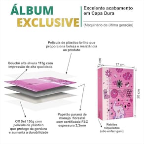 album de papelao parana duro embalado em papel couche impresso e plastificado com brilho. Parte interna com 26 folhas plásticas de polipropileno rebitados com capacidade de 208 fotos 10x15