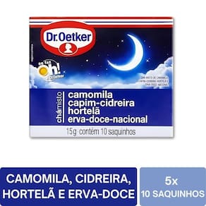 Ingredientes: Camomila, capim cidreira, hortelã, erva doce, aroma natural de ervas. Informações para alérgicos: Pode conter traços de glúten. Condições de armazenamento: Conservar em local seco e fresco. Após aberto, manter bem fechado. Validade estimada: 12 a 24 meses. Fabricante: Dr. Oetker.
