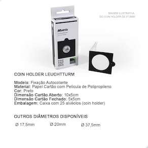 O Coins Holder Autocolante é uma importante ferramenta para armazenar e proteger suas Moedas.Os porta-moedas Coins Holder Leuchtturm protegem perfeitamente suas moedas de quaisquer influências do ambiente externo, graças à película utilizada que não contém amaciadores químicos.O Coins Holder tem como função proteger sua moeda:- evita o contato com o ambiente externo- evita o manuseio incorreto da peça (sem luvas ou com a mão suja)- facilita a exposição de sua peça na sua coleção- facilita a logística de sua peça, permitindo que você leve em eventos ou para negociar com mais praticidade e proteção- excelente organizador, pois centraliza a moeda no bolso da folha, deixando sua exibição muito mais bonita, organizada e apresentávelO Coins Holder Leuchtturm é produto de fabricação na Alemanha, e é conhecido por sua qualidade no material e em proteger as moedas. Diferente de qualquer outro Coins Holder, o Leuchtturm possui uma "pequena aba" utilizada para "empurrar" o Coins Holder, facilitando seu manuseio. Para isso, utilize as folhas adequadas para estes Coins Holders.No critério de organização, o Coins Holder se destaca ao promover a padronização da exposição de suas moedas. Tenha uma apresentação muito mais bonita e profissional utilizando Coins Holders.CARACTERÍSTICAS:Modelo: Fixação AutocolanteMaterial: Papel Cartão Preto com Película de PolipropilenoDimensão Cartão Aberto: 10x5cmDimensão Cartão Fechado: 5x5cmDiâmetro deste Anúncio: Ø 20mmEmbalagem: Caixa com 25 alvéolos (coins holder) cada caixaSUGESTÃO DE ARMAZENAMENTO DO COINS HOLDER COM A MOEDAO Coins Holder pode ser armazenado em folhas próprias para coleções de Moedas respeitando o espaço mínimo de 5x5cm cada bolso onde o holder será colocado, caixas organizadoras e separadoras, estojos (cartelas dobráveis) próprios para Coins Holders.COMO UTILIZAR:1- Para utilizá-lo você deve primeiramente dobrar ao meio, na marcação indicada, para facilitar o fechamento com a moeda.2- Em seguida, você deverá posicionar a moeda no centro do Coins Holder, em cima da película de plástico, onde a moeda será exibida. Certifique-se de que sua moeda está perfeitamente alinhada com alguma das laterais do Coins Holder pois após fecha-lo, não conseguirá mais mover a moeda.3- Dobre o coin holder ao meio, por cima da moeda, envolvendo-a completamente até colar.