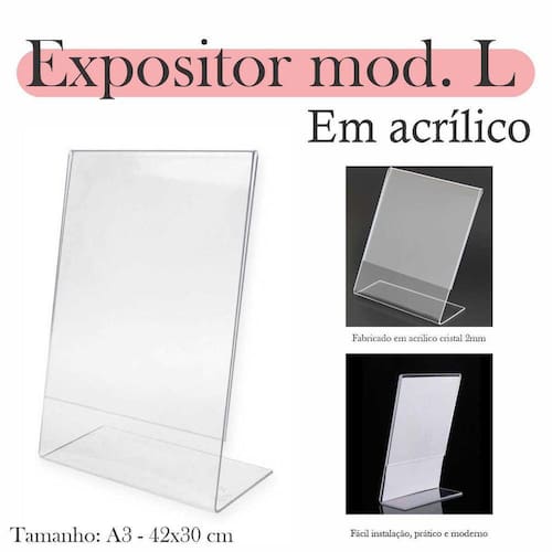 Display porta papel folha A3 ou expositor porta papel folha A3 de mesa e balcão.Formato: L inclinadoDivulgue diversos tipos de conteúdo de forma simples, fácil e eficiente.O que Expor nesse Display:- Cardápio- Pix.- Qr Code.- Fotos.- Papel e Folha em geral.- Aviso.- Propaganda.- Lembrete.- Comunicação Interna e Externa na Empresa.- Qualquer tipo de divulgação que você queira expor.Onde usar e colocar:- Mesa.- Balcão.- Qualquer tipo de local você pode colocar o display em cima para expor sua mensagem.Instrução de uso:Utilizar o produto em pé, no formato vertical.Características:- Peça fabricada com cortes, acabamentos e dobras.- Não amarela com o tempo.- Excelente resistência e durabilidade.- Material ACRILICO 2MM rígido, bem forte e resistente. Marca: Indústria Fenix