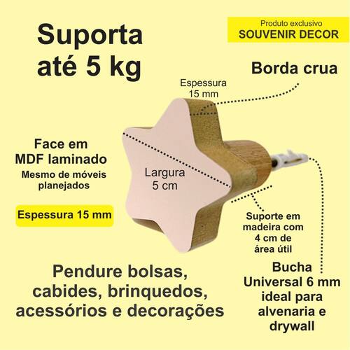 A face vai colada com super cola e acaba sendo apenas decorativa, pois é o suporte quem recebe o esforço, suportando até 5 Kg. Anúncio referênte à 5 unidades. Modelo: Estrela Tamanho da face: 5,0cm X 5,0cm; Material: MDF laminado 15mm melamínico | borda cru Cor: Rosa, Azul, Branco e Cinza