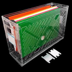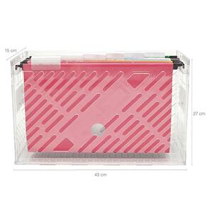 Garantia: 90 dias / Peso total: 5,54kg / Cor predominante: transparente / Ref.: 7794463444572; Dimensões de cada organizador: 43cm (C) x 14,5cm (L) x 27cm (A); Conteúdo: - 5 caixas arquivos transparentes; - 6 pastas suspensas cada; - 6 visores de etiquetas cada; - 6 etiquetas cada; - 6 grampos cada; Materiais: - Cartão Triplex Plastificado: pastas suspensas; - Poliestireno Cristal: caixa suporte; - Polipropileno: grampos plásticos; - Offset: etiquetas; - PVC: visores; Detalhes dos produto: - As caixas para arquivo transparentes possuem alças laterais e estrutura vazada; - As pastas suspensas plastificadas possuem fundo branco e hastes plásticas; - As caixas para arquivo comportam até 12 pastas suspensas cada; - As cores das pastas são diversas, sem opção de escolha; - As pastas comportam folhas de tamanho A4; - Não possuem tampas; Cuidados: não lavar com materiais abrasivos.