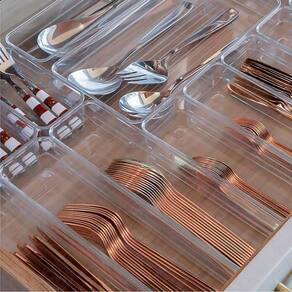 Esses organizadores são perfeitos para setorizar suas gavetas. Você compõe conforme os itens que serão organizados, além de serem empilháveis para otimizar o espaço utilizado e modulares para que você defina o tamanho e a quantidade que necessita para organizar melhor o seu ambiente. São ideais para temperos, materiais de escritório, gavetas e outros objetos pequenos. Em plástico de alta qualidade, transparente para facilitar a visualização dos objetos.