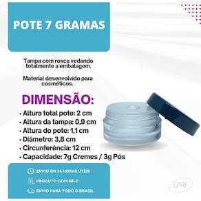 Especificações do Pote: Altura total pote: 2 cm Altura da tampa: 0,9 cm Altura do pote: 1,1 cm Diâmetro: 3,8 cm Circunferência: 12 cm Capacidade: 7g Cremes / 3g Pó