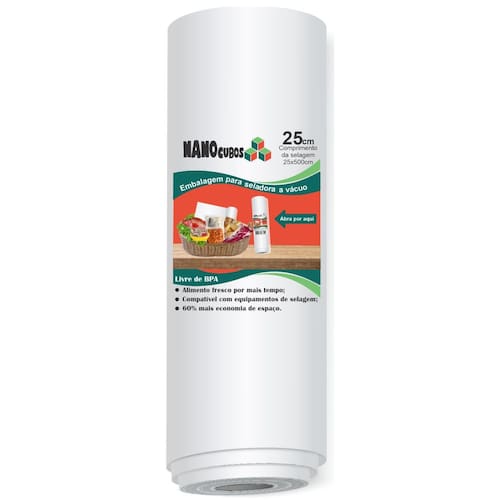 Embalagens 5 rolos NANOCUBOS 25 cm X 500 cm para seladoras a vácuo. Embalar produtos a vácuo é a melhor forma de mantê-los sempre protegidos por muito mais tempo. Ao embalar alimentos, a validade deles é completamente estendida, pois eles não terão nenhum contato com o ar e serão pouco afetados pela ação do tempo. Você pode embalar tanto alimentos crus como alimentos já preparados para serem consumidos em outro momento. Você economiza muito dinheiro e evita o desperdício Os sacos para vácuo Nanocubos são produzidos com alta tecnologia em Nylon Poli seguindo padrões de qualidade internacional. Possuem 12 micras, 3 barreiras de proteção, sem presença de BPA Não tóxicos e funcionam com equipamentos de embalagens a vácuo. Além de alimentos, é possível utilizá-lo com objetos pessoais, documentos ou utensílios, conservando-os como novos por muito tempo e aumentando sua vida útil.
