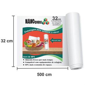 5 Rolos Nanocubos 32x500cm Embalagem Ranhura Seladora a Vácuo Embalagem 5 rolos Nanocubos 32 cm X 500 cm para seladoras a vácuo. Embalar produtos a vácuo é a melhor forma de mantê-los sempre protegidos por muito mais tempo. Ao embalar alimentos, a validade deles é completamente estendida, pois eles não terão nenhum contato com o ar e serão pouco afetados pela ação do tempo. Você pode embalar tanto alimentos crus como alimentos já preparados para serem consumidos em outro momento. Você economiza muito dinheiro e evita o desperdício Os sacos para vácuo Nanocubos são produzidos com alta tecnologia em Nylon Poli seguindo padrões de qualidade internacional. Possuem 12 micras, 3 barreiras de proteção, sem presença de BPA Não tóxicos e funcionam com equipamentos de embalagens a vácuo. Além de alimentos, é possível utilizá-lo com objetos pessoais, documentos ou utensílios, conservando-os como novos por muito tempo e aumentando sua vida útil.