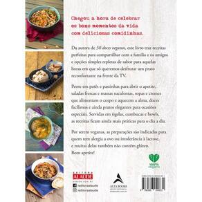 Este livro traz receitas para compartilhar com a família e os amigos e opções para aquelas horas em que só queremos saborear uma comidinha gostosa na frente da TV. Por serem veganas, as receitas são indicadas para quem tem alergia a ovo ou intolerância à lactose. A maioria da receitas também não contém glúten. Da mesma autora de 50 doces veganos , o livro está dividido em 5 capítulos: petiscos e pastas de abrir o apetite; sopas e cremes para esquentar o coração; massas e saladas práticas ; pratos principais reconfortantes , e sobremesas de dar água na boca . Servidas em tigelas, cumbucas e bowls, e por isso mais práticas para o dia a dia, as receitas são perfeitas para trazer ainda mais alegria aos momentos de descontração com a família e os amigos.