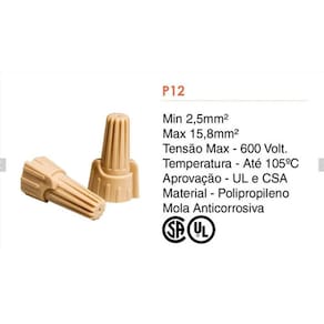 os conectores de torção emendam cabos flexíveis e fios rígidos de forma prática e segura. Ao contrário da fita isolante que resseca com o calor e o tempo os conectores mantém a emenda isolada por muito mais tempo. Protegida por uma capa isolante, encontra-se a mola interna que se expande para acomodar firmemente os condutores e os mantém unidos sob pressão constante, sem danificá-los, para soltar os fios basta girar o conector no sentido anti-horário, podendo ser em outra conexão. Especificações aplicação: 2,5 a 15,8mm soma dos cabos, ex: fio 1,0mm + cabo 1,5mm=2,5mm temperatura: até 105ºc. Voltagem: até 600 volts aprovação ul/csa