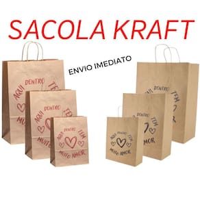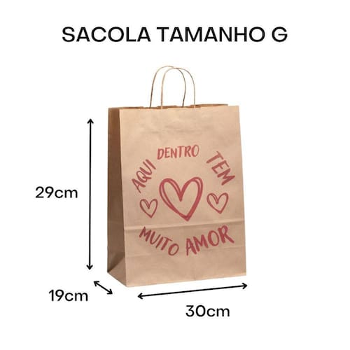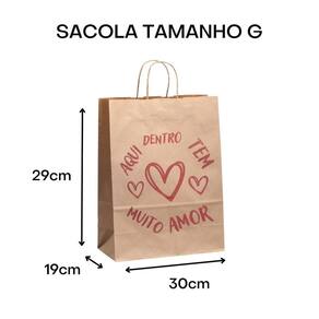 SACOLA DE PAPEL KRAFT ESCRITO "AQUI DENTRO TEM MUITO AMOR"