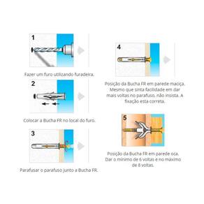 Buchas FR Perfix para Parede Oca Bloco Tijolo Baiano Tamanho: 6mm Quantidade: 5 Unidades de Bucha FR - Perfix 6mm Medidas da Bucha: Comprimento da bucha mm : 35 Profundidade mínima do furo mm : 45 Diâmetro do parafuso: 3,5 - 4,0 mm Não Acompanha Parafusos QUALIDADES E DIFERENCIAIS: ========================== Ideal para uso em paredes de bloco oco, tijolo baiano, tijolo maciço, cimento, concreto. Apresenta aletas e braços que fazem a bucha não girar dentro do furo. Produzido em polietileno de alta densidade. Utilizado com parafuso de rosca madeira ou auto atarraxante. Utilizado para fixação de armários, prateleiras, quadros, acessórios de banheiro, etc. do vendedor: 90 dias Marca: Bullcom