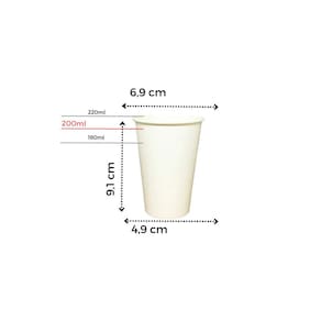 180 ml auferido e 220 ml volume total. Pacote com 50 unidades. 10x50 Medidas: altura: 91mm boca: 71mm fundo: 49mm Conteúdo da embalagem: 500 copos de papel biodegradável branco 200ml