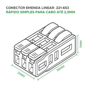 Este conector emenda rápida linear tripla da série 221 oferece uma solução prática e eficiente para emendar três pares de fios e cabos com seções transversais que variam de 0,2 a 2,5mm. Com capacidade de corrente de até 24A e tensão máxima de 450V, é ideal para diversas aplicações elétricas de baixa potência, tanto residenciais quanto comerciais.