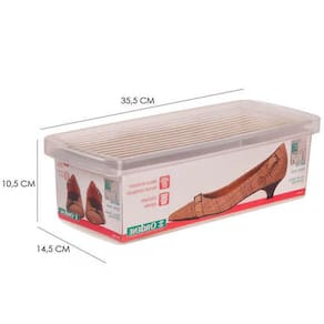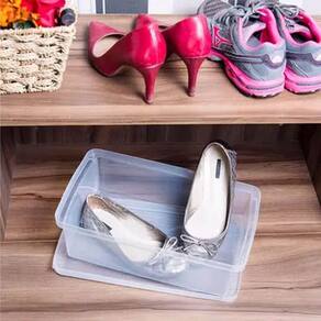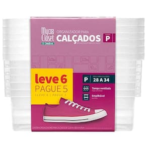 Garantia: 90 dias / Peso: 1,088kg / Cor predominante: cristal / Ref: OR60050 Dimensões de cada caixa: 35,5cm (C) x 14,5cm (L) x 10,5cm (A); Dimensões internas: 30cm (C) x 11,5cm (L) x 9cm (A); Tamanho P: ideal para calçados 28 a 34. Capacidade: um par por caixa. Tampa: ventilada; Caixas: empilháveis. Material: polipropileno.