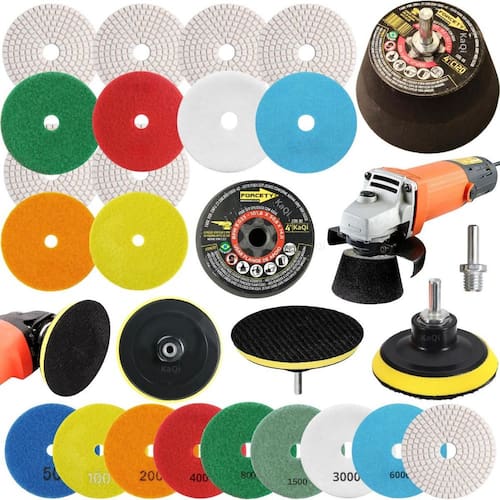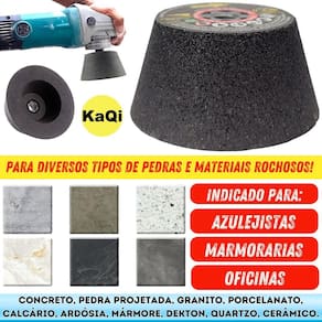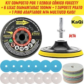 6 Lixas Grão 4 Pol. 100mm Diamantada + 1 Rebolo Cônico 45 Graus + 1 Disco Prato + 1 Pino M14 KaQi GRÃO: 100-200-200-200-400-400 Kit 6 Lixas Diamantadas Grão Disco 4 Polegadas 100mm KaQi + 1 Rebolo Grão 120 Copo Cônico 45 Graus 4 Polegadas M14 Forcety. + 1 Suporte Prato Disco 100mm M14 KaQi + 1 Pino Adaptador Multiuso Rosca Universal M14 KaQi. Para Desbastes, Polimentos, Acabamentos, Boleamentos, Lixamentos a Seco e Úmido. Ideal para profissionais e entusiastas de reformas e construção. Alta qualidade, resistência e desempenho superior. Transforme o acabamento das suas superfícies com o Kit 6 Lixas Grão 4 Pol. 100mm Diamantada + 1 Rebolo Cônico 45 Graus + 1 Disco Prato + 1 Pino M14 Desenvolvido para oferecer o melhor polimento e acabamento, é perfeito para quem busca resultados profissionais, tanto em pedras como granitos, mármores, cerâmicas, quanto ardósia, calcário, dekton, quartzo, porcelanato, pedra projetada, concreto, nanoglass, super nano, vidro e muito mais. Seu lixamento pode ser a seco e a úmido, o que proporciona um processo mais rápido, sem gerar calor excessivo. O Rebolo Copo Cônico 10x5cm Grão 120 Forcety é ideal para desbastes, retificações, boleamentos e acabamentos. Projetado para oferecer eficiência, durabilidade, confiabilidade e resultados excepcionais, é perfeito para profissionais e entusiastas de reformas e construções. Não à toa, é o rebolo número 1 das marmorarias, azulejistas e oficinas de todo Brasil O Disco 100mm e o pino adaptador M14 podem ser utilizados em conjunto com as lixas e com o rebolo. Com sistema de gruda e desgruda fácil, podem utilizadas em lixadeiras, esmerilhadeiras, politrizes, furadeiras, parafusadeiras. Permite, assim, ampliar a gama de usos do kit. Principais características: 1. Durabilidade extra, alta resistência ao desgaste, longa vida útil e desempenho, além de excelente performance em diversos tipos de materiais. 2. Acabamento impecável no desbaste e polimento de superfícies de pedra, mármore, calcário, ardósia, porcelanato e outros, sem deixar manchas ou marcas indesejadas. Pode ser trabalhada em superfícies claras ou escuras. Oferece uma remoção eficiente de material e um acabamento uniforme. 3. Versatilidade no uso com diversas ferramentas, já que pode ser Utilizado em esmerilhadeiras, lixadeiras, politrizes e furadeiras elétricas. 4. Eficiência de montagem, uma vez que possui sistema de fixação rápido. Basta encostar a lixa no suporte do disco para grudar, e, para remover, é só puxar na direção contrária. Conteúdo da embalagem: 6 Lixas DÁgua 4 Pol. 100mm Disco Diamantado KaQi GRÃO. + 1 Rebolo Grão 120 Copo Cônico 45 Graus 4 Polegadas M14 Forcety. + 1 Suporte Prato Disco 100mm M14 KaQi + 1 Pino Adaptador Multiuso Rosca Universal M14 KaQi. Especificações Lixas: Diâmetro: 100mm 4 Polegadas . Furo central: 1,3cm diâmetro. Espessura 1 unidade: 0,4cm. Maleabilidade: flexível. Lixamentos: seco e úmido. RPM: ideal entre 3000 a 5000 rotações por minuto. Material da lixa: diamante sintético industrial e resina premium. Costado: tipo vellcro. Fácil de fixar e remover. Especificações Rebolo: Trabalho: a seco ou refrigerado com água. Diâmetro: 4 Polegadas 100mm 10,16cm x altura 5,08cm. Velocidade: 9023RPM. Rosca: M14. Material: Carbeto de Silício SiC com diamantes. Feito para ser conforme norma ABNT NBR 15230. Especificações Prato Suporte: Diâmetro do disco: 100mm 4 Polegadas . Modelo do disco: M14 com superfície tipo vellcro. RPM: até 12000. Rosca: padrão M14 14mm . Especificações Pino Adaptador M14: Para Furadeira Parafusadeiras, Politrizes, Lixadeiras e Esmerilhadeiras. Fixa em discos pratos M14 para uso com lixas, boinas, espumas de polir, entre outros acessórios. Rosca: M14 14mm . Pino largura: 8mm. Altura total: 4,4cm.