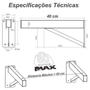 -Quando instalado em par (ou mais) e distribuído em espaços iguais ou inferiores a 50 cm, suporta até 80 kgs/par