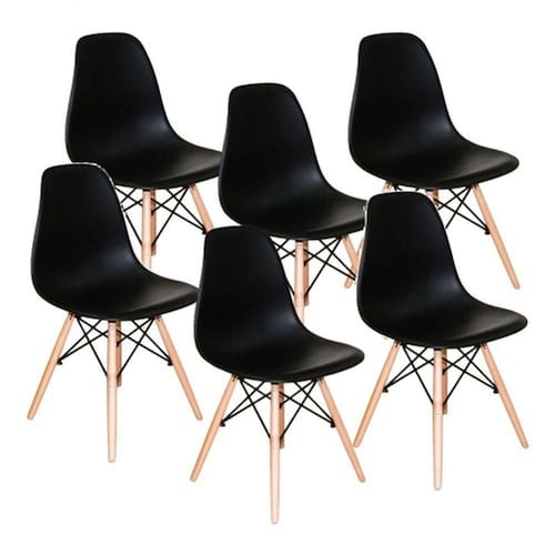 6 Unidades Cadeira De Jantar Decoreshop Charles Eames Dkr Eiffel, Cor Preto Cadeira Eiffel Eames Base Madeira A CADEIRA CHARLES EAMES EIFFEL foi criada nos anos 50, é vencedora do Museu de Nova York da concorrência Design de Mobiliário Low-Cost Arte Moderna Internacional. Sua base é em MADEIRA no formato de uma torre faz com que o ambiente não fique sobrecarregado. Adequa-se perfeitamente para compor conjunto de mesa de jantar ou qualquer outro ambiente em sua casa ou escritório. Ideal para receber amigos e familiares com um toque de elegância e charme. As pernas da cadeira são em madeira e fios de aço preto no qual garantem estabilidade à cadeira.