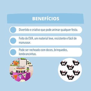 Uma caixinha surpresa festa morcego em eva é um produto divertido e criativo para animar qualquer comemoração. Essa caixinha é feita de eva, um material leve, resistente e fácil de manusear. A caixinha tem um formato de morcego divertido.Você pode rechear a caixinha com doces, brinquedos, lembrancinhas ou o que a sua imaginação mandar. A caixinha surpresa festa morcego em eva é ideal para decorar a mesa do bolo, distribuir entre os convidados ou usar como centro de mesa. Ela combina com temas como halloween, vampiros, bruxas ou fantasia. A caixinha surpresa festa morcego em eva é um produto que vai fazer a alegria da criançada e dos adultos. Garanta já a sua e faça da sua festa um evento inesquecívelO que você irá receber:-06 caixinhas surpresa festa morcego em evaBenefícios do produto:- divertido e criativo que pode animar qualquer festa.- feito de eva, um material leve, resistente e fácil de manusear.- pode ser recheado com doces, brinquedos, lembrancinhas.- combina com temas como halloween, vampiros, bruxas ou fantasia.Características do produto:- medida: 10x10cm- material: evaTags mais pesquisadas:- decoração kit halloween festa morcego lembrancinha caixinhas eva 6 unidades aniversario decorar decorativa decorativo preto 10x10cm premium decorações