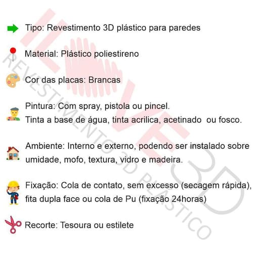 1- Você mesmo consegue instalar, não precisa de um ; 2- Material resistente, o relevo não amassa e não afunda; 3- Instalação sem sujeira e sem quebra quebra; 4- Ideal para paredes com umidade, mofo, textura, madeira e azulejo; 5- Serve tanto para áreas internas, quanto externas; 6- É lavável; 7- Durabilidade de 10 anos; 8- Não precisa de pintura; 9- Instalação com fita dupla face ou cola de contato; 10- Cortes das placas é a laser.