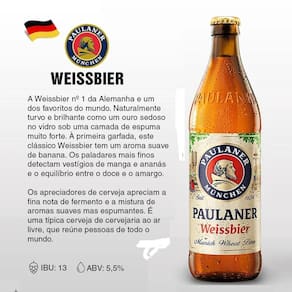 6x Cerveja Alemã PAULANER Weissbier 500ml Cerveja de malte trigo, naturalmente turva. Estilo German Weizen e tipo de fermentação ALE alta fermentação . Aromas frutados provenientes da levedura. Na boca destacam-se as notas de frutas amarelas, refrescante com boa acidez e amargor equilibrado. Umas das Weissbiers alemãs mais consumidas do mundo. Estilo ou Família German Heffeweizen Cor da Cerveja - Amarelo turvo teor Alcoólico - 6,5% Temperatura de Consumo - 2º - 4º Origem: Alemanha Tipo: Weissbier Ingredientes: Água, malte de cevada, malte de trigo, extrato de lúpulo, lúpulo e levedura. Contém glúten. paulaner engagiert significa Paulaner está comprometida - um lema que norteia nossa responsabilidade social. Como o acionista majoritário da empresa é uma família, o sucesso a longo prazo é de grande importância para nós. E o sucesso a longo prazo requer um ambiente estável. Por isso, para nós, sustentabilidade significa ser um parceiro confiável e sempre com uma visão de longo prazo. Esse é o padrão que estabelecemos em todo o nosso trabalho e determina em igual medida nossas relações com fornecedores, sociedade e meio ambiente.