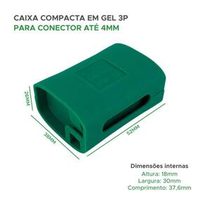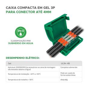 Esta Caixa Compacta em Gel 3P oferece proteção e isolamento para conexões elétricas de até 3 polos vias e fios com diâmetro de até 4mm. Seu design compacto e preenchimento com gel isolante garantem vedação contra umidade, poeira e corrosão, ideal para diversas aplicações.