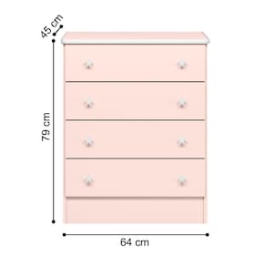 A cômoda é feita em MDP 15/12mm, possuindo quatro gavetas com corrediças metálicas.