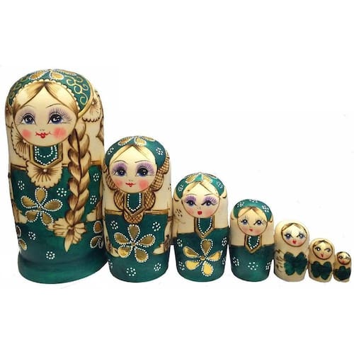 7pcs bonito suéter verde trança menina russa aninhamento bonecas tapete