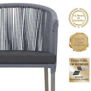 Combinando estilo e resistência, esta cadeira traz o melhor do design contemporâneo em alumínio com micro pintura e acabamento em corda náutica. O estofado impermeável completa o conforto e a funcionalidade, tornando-a ideal para ambientes externos e internos.