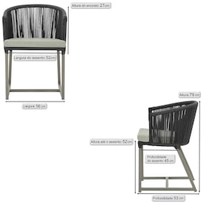 Combinando estilo e resistência, esta cadeira traz o melhor do design contemporâneo em alumínio com micro pintura e acabamento em corda náutica. O estofado impermeável completa o conforto e a funcionalidade, tornando-a ideal para ambientes externos e internos.