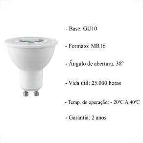 Nós da acende a luz procuramos trazer o que há de mais atual e moderno no mundo da iluminação priorizando sempre a qualidade. Procuramos não apenas atender às suas necessidades, mas superar expectativas. Assim estabelecendo uma relação de confiança Nossa missão é garantir a satisfação total dos nossos clientes. Neste kit contém: - 08 unidades da lâmpada - Lâmpada led dicroica mr16 gu10 6w 4000k branco neutro - base: gu10 - formato: mr16 - temperatura de cor: 4000k branco neutro - tecnologia de iluminação: led - tensão: bivolt - potência: 6w - fator de potência: 0.90 - fluxo luminoso: 640lm - ângulo de abertura: 38 - vida útil : 25.000 horas - temp. De operação: -20c a 40c - : 2 anos