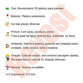 8 Placas Decorativas 3d Kit Revestimento para Parede Estrelar Quantidade do anúncio: 2m 8 placas Modelos: Estrelar Todas as placas são da cor branca As placas são de poliestireno PSAI plástico Tamanho: 50x50cm exceto modelos piramidal e prisma 48x 48cm Espessura: 1 mm ============================================================= 10 motivos do porquê você deve comprar as nossas placas 3D 1- Você mesmo consegue instalar, não precisa de um ; 2- Material resistente, o relevo não amassa e não afunda; 3- Instalação sem sujeira e sem quebra quebra; 4- Ideal para paredes com umidade, mofo, textura, madeira e azulejo; 5- Serve tanto para áreas internas, quanto externas; 6- É lavável; 7- Durabilidade de 10 anos; 8- Não precisa de pintura; 9- Instalação com fita dupla face ou cola de contato; 10- Cortes das placas é a laser. ============================================================= Ambiente: Interno e externo, podendo ser instalado sobre umidade, mofo, textura, vidro e madeira. Pintura: Tinta a base de água, acrílica, acetinado ou fosco. A pintura pode ser feita com compressor de ar, pincel ou spray. Marca: Não Informado