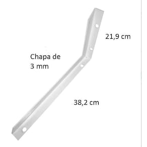 Você tem ideia nos inúmeros lugares que pode utilizar uma mão francesa A mão francesa pode ser utilizada em prateleiras, mesas, suportes, bancadas, vidros, entre outros. Nossas mãos francesas são muito resistentes, aguentando até 50 kg por suporte. Acompanha 16 dezesseis parafusos e 16 dezesseis buchas Nº8 por suporte. Informações Técnicas: Cor: Branca Resistencia: até 50 kg por suporte Dimensão: 38,2cm x 21,9cm Espessura da Chapa: 3mm OBS: Recomenda-se espaçamento máximo entre os suportes de 50cm. Inclui no kit: - 8x Mão francesa Suporte - 16x Parafusos 5,0 x 40mm - 16x Buchas 8mm Ean: 7891230022299