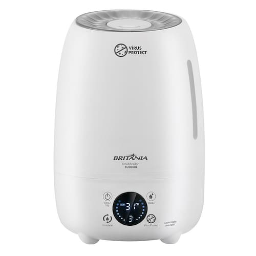Já pensou em um umidificador com sistema de proteção para o ambiente? Não? nós pensamos!! O Umidificador Britânia 4,8L BUD06BI tem tecnologia Vírus Protect, através do sistema de ionização, esteriliza e purifica o ar, eliminando bactérias, poeiras e partículas de pólen, tornando o ar limpo em pouco tempo. Compacto e silencioso, ele garante dias e noites mais tranquilos, inclusive com a função Sleep, para não se preocupar em levantar para desligar o aparelho. Com sistema Ultrassônico e controle de intensidade de névoa umidifica o ambiente conforme necessário trazendo conforto e saúde , isso significa menos rinite, garganta seca, olhos irritados e problemas respiratórios. É a Britânia cuidando de você!