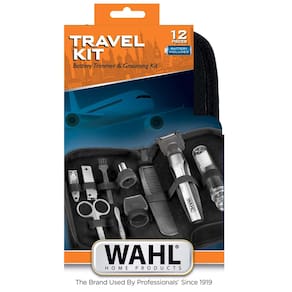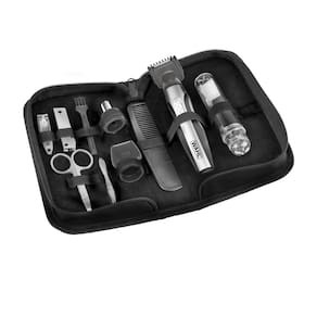 O Kit Aparador de Pelos Wahl Clipper Travel à Pilha 5604-208 - Cinza acompanha tesoura, escova de dente, pinça, cortadorde unha, pente de bolso, lima de unha.