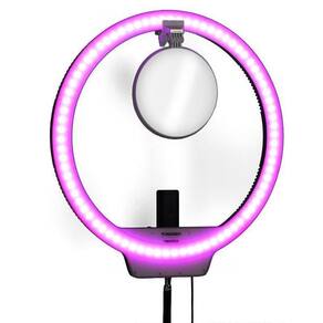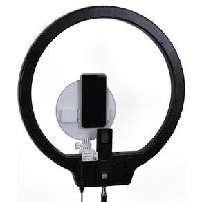 Acompanha este ring light, um controle para os ajustes de intensidade de luz e configuração de cores, com ele é possivél fazer tudo remotamente à distância.
