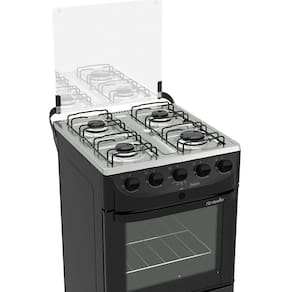 Características: Tampo de vidro temperado Mesa em inox Botões removíveis Queimadores de aço esmaltado Painel ergonômico Pés altos Encaixe dos queimadores vedado à mesa 1 queimador família 2W 3 queimadores médios 1,7W Queimador de forno 1,9W Acendimento automático total Puxador de forno em metal com abertura ergonômica Forno total clean com amplo visor Forno com 1 grade ajustável em dois níveis Proteção térmica com duplo vidro no forno Forno com válvula de segurança