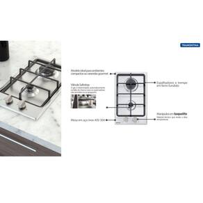 Funcionamento: Gás Mesa: Aço Inox AISI 304 Trempes: Ferro Fundido Manípulos: Baquelite Acendimento super automático: Sim Válvula de segurança Safestop: Sim Semiprofissional: Não Panelas: Todos os tipos Queimadores: 2 1 x Auxiliar: 1,00 kW 1 x Rápido: 3,00 kW Tensão: 127 V - 220 V (bi-volt automático) Frequência: 50 / 60 Hz Rendimento: 61% Eficiência: "B" Nicho para instalação (L x P): 280 x 480 mm Imagens Ilustrativas. As tonalidades e acabamentos (texturas) podem variar de um produto a outro.