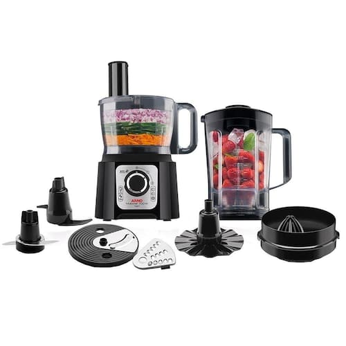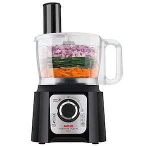 Com o novo processador Arno Multichef 7 em 1 você poderá processar sua própria comida e do seu jeito. Com ele você consegue picar, ralar, fatiar, bater massas pesadas, emulsificar, espremer um delicioso suco sem bagaços e liquidificar as mais variadas receitas. São 3 lâminas processadoras,1 batedor de massas pesadas,1 emulsificador, 1 espremedor e mais uma super jarra de liquidificador de 3,1L de capacidade total.