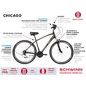 Conquiste o novo jeito de se movimentar pela cidade, com segurança, agilidade e conforto. A Bicicleta Aro 700 Schwinn Chicago é moderna, com uma pitada de grafismo retrô, que dá um charme especial ao seu design.