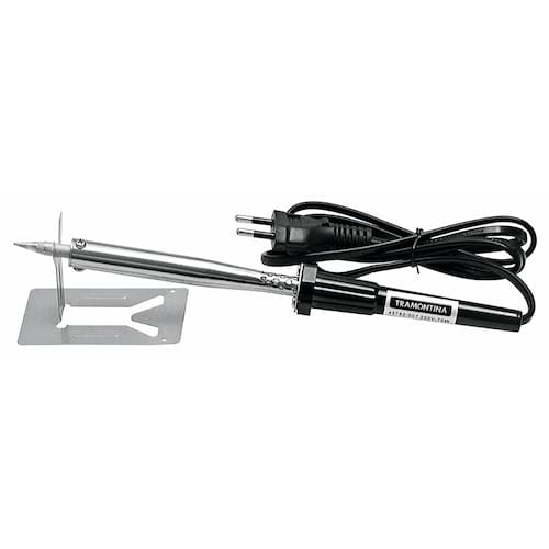 Ideal para fazer pequenos reparos! Esse ferro de solda, da Tramontina, é uma ferramenta utilizada para fazer pequenos reparos por meio de solda de estanho, e foi produzida e testada conforme normas específicas. Tem a ponteira e a haste metálicas, cabo de plástico, cabo elétrico de 1 metro, potência de 70 Watts, e ainda vem com suporte de metal para descanso.