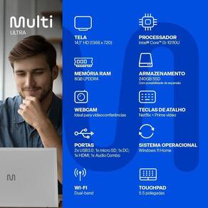 Especificações: - Processador: Intel Core i3-10110U (Cache de 4M, 2.10 GHz) Gráficos UHD Intel para processadoresIntel Core da 10 Geração - Tela: 14,1" Resolução 1366 x 720 HD - Memória: 8GB LPDDR4 - Armazenamento: SSD 240GB com opção de expansão via SSD M.2 - Sistema Operacional Windows 11 Home - Portas: 2 x USB 3.0; 1 x HDMI; 1 x Micro SD; 1 x Audio Combo; 1 x DC - Conexões: WiFi AC - 2.4GHz e 5GHz dual-band - Câmera: 2,0MP - Teclado: Padrão ABNT2 com tecla de atalho NETFLIX + Prime Video - Áudio de Alta Definição (HD) - Fonte de Alimentação: 100~240V, 57W - Bateria: 7.6V 5000mAh - Conteúdo de Embalagem: Notebook Multi Ultra, fonte de alimentação e guia rápido - Dimensões: 325 x 214,25 x 18,6mm - Peso: 1,427 Kg - Cor: Cinza - Garantia: Este produto está garantido pela Multilaser pelo período de 1 ano e acessórios pelo período de 3 meses
