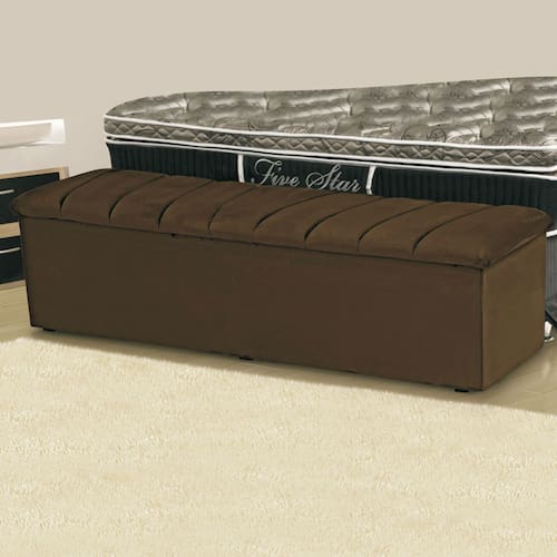 Calçadeira tipo baú com tampo superior em formato de gomos em alto relevo, estrutrura de madeira branca tratada, tapeçada com espuma de poliuretana, revestimento em material sintético com malha da marca couro rios, espaço interno para guardar edredons e travesseiros.
