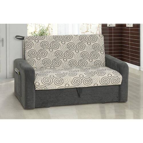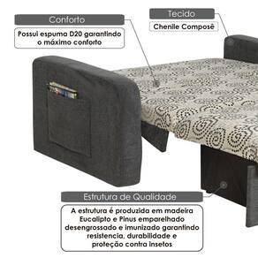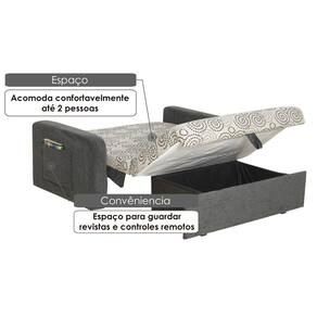 - Cor: Cinza/Estampado - Estrutura em Madeira Eucalipto/ Pinus - Tecido: Chenile Composê - Espuma D20 - Percinta: Borracha - Sistema de Abertura: Possui uma alça na parte frontal usada para a abertura do produto - Pés: PVC quadrado fixado com pregos - Porta obejtos nas laterais - Baú embutido - 2 lugares