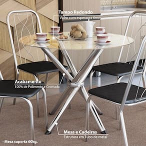 Características - Cromado/Preto. - 01 Mesa Redonda Volga. - 04 Cadeiras Viena. - Estrutura em tubo de metal. - Acabamento: 100% de polimento, cromada com processo 100% automatizado. - Tampo de vidro com espessura 6mm. - Assentos: Chapa em MDP 15 mm e espuma de densidade 18. - Revestimento dos Assentos: Corino. - Altura até o assento: 46 cm. - Mesa suporta 60 kg. - Cadeiras suportam 130 kg.