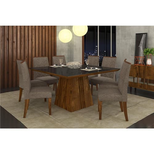 A mesa de jantar possui estrutura em MDF e MDP, impressão U.V. texturizada para maior valorização da peça, apliques decorativos em MDF, em alto relevo no centro da base, tampo em MDF, MDP e vidro pintado, capacidade para acomodar até 8 lugares e sapatas deslizadoras, que facilitam o manuseio e a limpeza do ambiente.