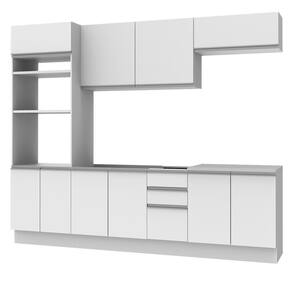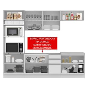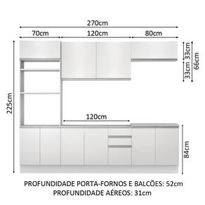 Outro grande diferencial desta cozinha é a profundidade maior, como uma cozinha planejada: 52 cm no paneleiro e balcão inferior e 31 cm no aéreo. As medidas totais da Cozinha Madesa Viena são: 270 cm de largura e 225 cm de altura.