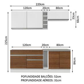 A profundidade é de cozinha planejada: 52 cm nos balcões e 31 cm nos aéreos. As medidas totais são: 220 cm de largura e 225 cm de altura.