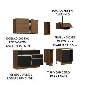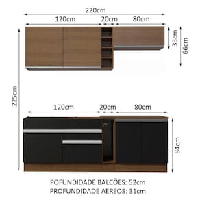 A profundidade é de cozinha planejada: 52 cm nos balcões e 31 cm nos aéreos. As medidas totais são: 220 cm de largura e 225 cm de altura.