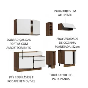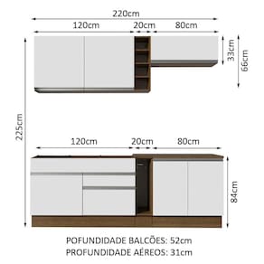 A profundidade é de cozinha planejada: 52 cm nos balcões e 31 cm nos aéreos. As medidas totais são: 220 cm de largura e 225 cm de altura.